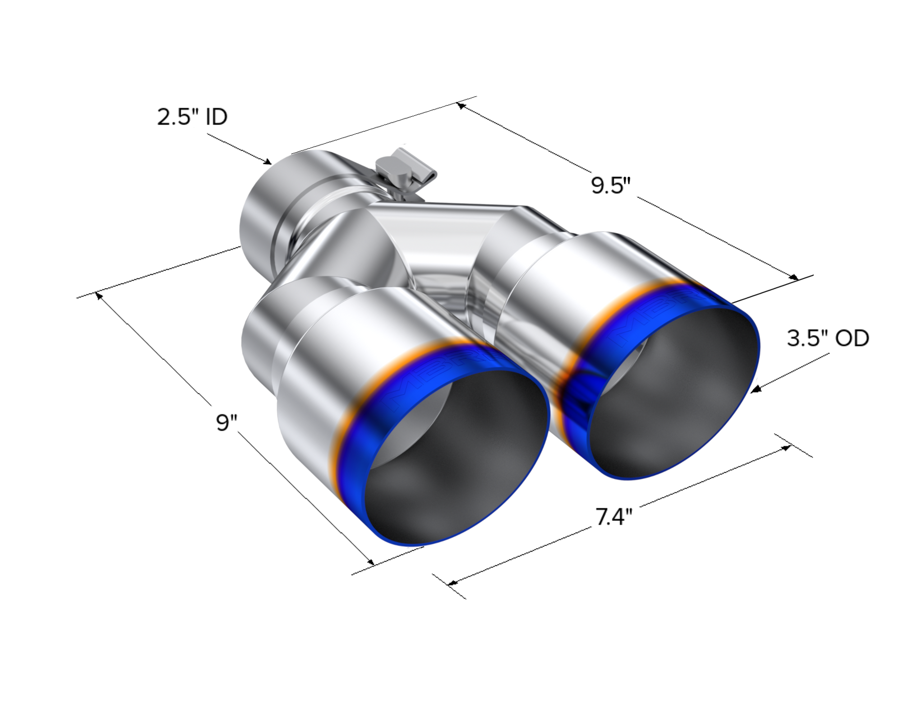 T304 Stainless Steel, Burnt End Tip, 2.5 Inch ID, Dual 3.5 Inch OD Out, Staggered Left 9 Inch/ Right 9.5 Inch Length, Single Wall