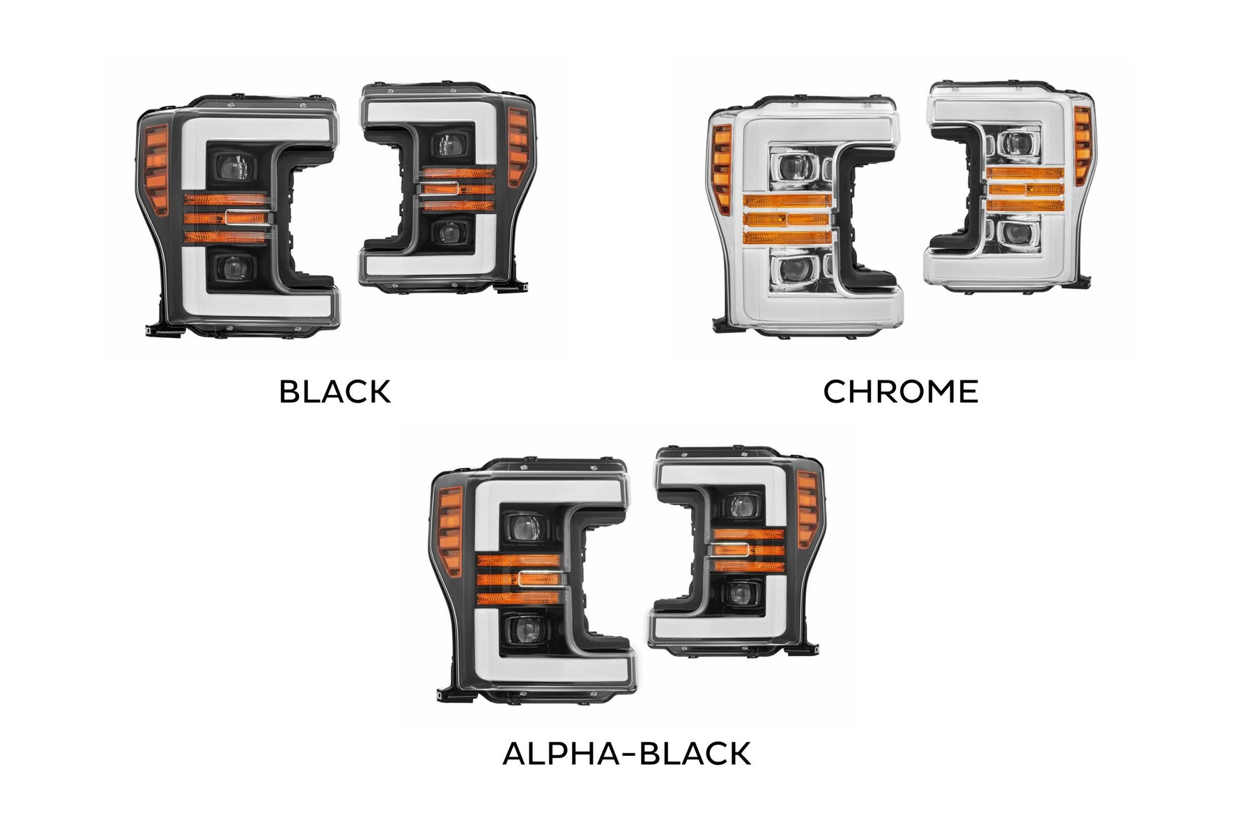AlphaRex Is a relatively new brand in the automotive aftermarket industry. They've become known for building headlights that are unique in style, offer various color choices, and better than average construction quality. While (in our testing) they don't do as well as the slightly more expensive Morimoto XB LED headlights, they do offer good bang for the buck and certainly worth considering. If you're interested to see what else we've got in stock for your truck, use the buyer's guide on our website! AlphaRex Design AlphaRex developed the Ford Super Duty PRO-series headlights based on its stock design and add a LED tube around the edge as DRL and sequential turn signal. At the side of these Toyota 4Runner headlights is the amber reflector lens, and there are amber halogen light bulbs at the side for turn signal light as well. These projector headlights are with dual projector design, with the outer projector as low beam, and inner projector as high beam. The headlights use basic H7 halogen bulbs for low beam and another H7 halogen bulb for high beam. You can also upgrade them with a set of high output LED bulbs for even more light on the road. LED Projector Technology AlphaRex integrated their patented rectangular projector lenses into the Ford Super Duty Pro-series headlights. The projection cut-off line is perfect for American LHD regulation. Feature: The Alpharex Ford Super Duty Pro-series projector headlights come with sequential turn signal light as well as DRL light tube. Housing: The Ford Super Duty Pro-series projector headlights are offered with either a chrome, matte black, or shiny midnight black housing. The chrome housing gives your truck a stock housing look and match your truck if you have a lot of chrome accessories. On the other hand, the black housing gives your truck a sporty look and easily match with any color truck and front grill. Above all, the gloss/ jet black housing and mid-night black housing (all black housing with glossy finish) are their specially designed versions that has a combination of glossy looks mixed with the black paint, and it will give your truck a sporty and luxury look at the same time. Lenses: The AlphaRex headlight lenses are made of polycarbonate plastic. They also apply a layer of anti-fog agent on the headlights lens; thus, it allows better light output in extreme weather. In addition, they also apply another coating to protect the lens against yellowing and oxidation. SAE/DOT Compliance: Our Ford Super Duty Pro-series projector headlights are compliant with SAE and DOT FMVSS108 regulations. Moreover, all our products are certified to ISO-9000, ISO-9001 and ISO-9002. Most importantly, we inspect every detail of the lights to make sure we are satisfied and so are our customers. Installation: Our projector headlights are plug-n-play direct replacement for your truck. You can download the installation guide from the link in the listing above. Because these headlights have a DRL feature, you will need to apply the DRL module included in the package. No modification is required for installing these headlights; thus, our headlights are easily removable when you need to return or sell your truck and it will not void your factory warranty.