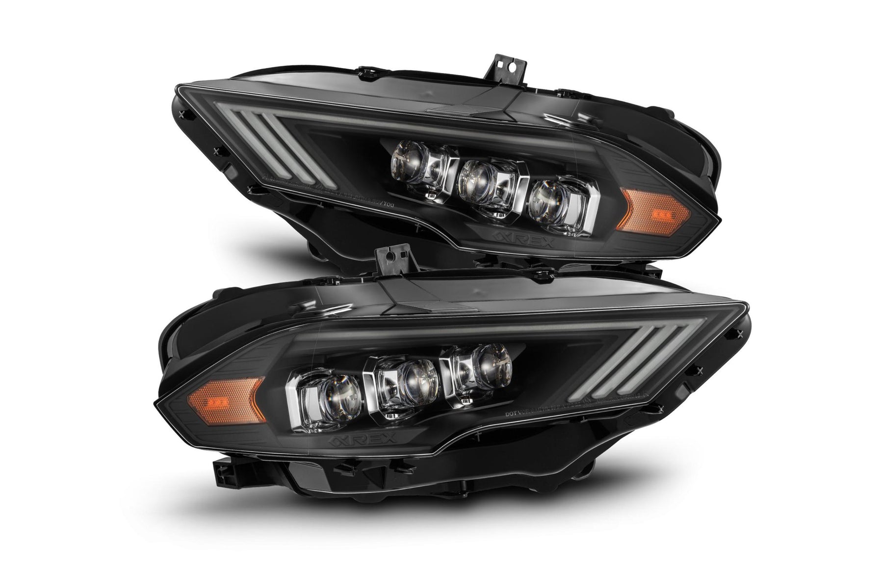 AlphaRex Is a relatively new brand in the automotive aftermarket industry. They've become known for building headlights that are unique in style, offer various color choices, and better than average construction quality. While (in our testing) they don't do as well as the slightly more expensive Morimoto XB LED headlights, they do offer good bang for the buck and certainly worth considering. If you're interested to see what else we've got in stock for your car, use the buyer's guide on our website! AlphaRex Design Alpharex Nova Series Headlights for the Ford Mustang use their signature 3D ice-cube projector lens system inside. Besides the horizontal NOVA projector row, They have also added a LED tube around the edge as DRL and sequential turn signal. The LED tube is not only used as switchback DRL and turn signal, it also has the activation light feature which is an animated lighting sequence when you unlock and lock your vehicle. These projector headlights have a quad projector design, with the outer 3 projector as low beam, and inner projector as high beam. Ice Cube Projector Technology AlphaRex integrated their patented Ice Cube 3D LED Projectors that are powered by Osram Black Flat LED Chips. The jewel eye projectors look great inside of the Ford Mustang Nova Series Headlights. The projection cut-off line is perfect for American LHD regulation. Features: The AlphaRex Ford Mustang Nova-series projector headlights come with switchback DRL, sequential signal light, and the signature activation light feature, which is a sequential light show when you unlock your car. Housing: The Ford Mustang Nova-series projector headlights are offered with either a chrome, matte black, or shiny midnight black housing. The chrome housing gives your car a stock housing look and match your car if you have a lot of chrome accessories. On the other hand, the black housing gives your car a sporty look and easily match with any color car and front grill. Above all, the gloss/ jet black housing and mid-night black housing (all black housing with glossy finish) are their specially designed versions that has a combination of glossy looks mixed with the black paint, and it will give your car a sporty and luxury look at the same time. Lenses: The AlphaRex headlight lenses are made of polycarbonate plastic. They also apply a layer of anti-fog agent on the headlights lens; thus, it allows better light output in extreme weather. In addition, they also apply another coating to protect the lens against yellowing and oxidation. SAE/DOT Compliance: Our Ford Mustang Nova-series projector headlights are compliant with SAE and DOT FMVSS108 regulations. Moreover, all our products are certified to ISO-9000, ISO-9001 and ISO-9002. Most importantly, we inspect every detail of the lights to make sure we are satisfied and so are our customers. Installation: Our projector headlights are plug-n-play direct replacement for your car. You can download the installation guide from the link in the listing above. Because these headlights have a DRL feature, you will need to apply the DRL module included in the package. No modification is required for installing these headlights; thus, our headlights are easily removable when you need to return or sell your car and it will not void your factory warranty.