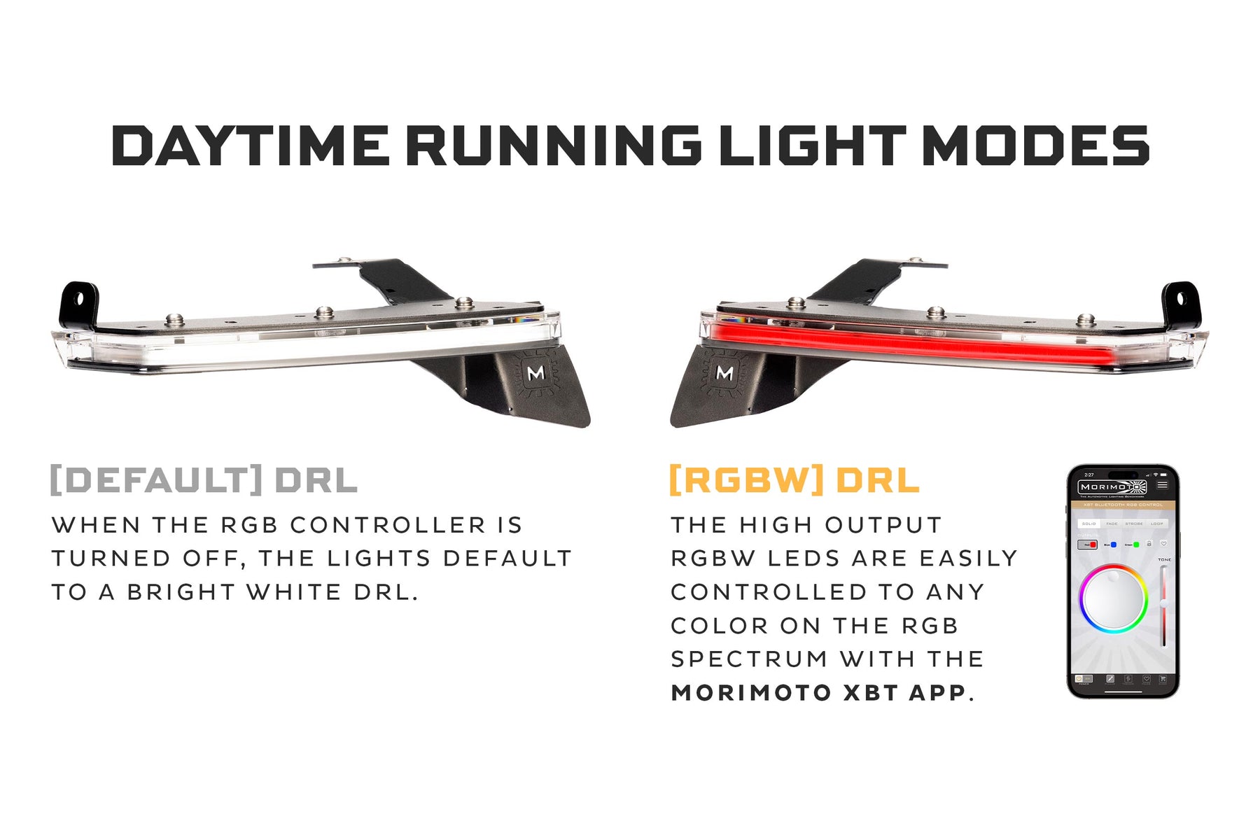 Fender Chop DRLs: Modifying your Jeep knows no bounds, but when it comes to an OEM+ look, replacing the lower section of your fenders with a low-profile DRL is a simple yet clean upgrade. While Morimoto XRGB LED DRLs are not the first to the market, they’ve been through rounds of design, fitment, and engineering phases to become the best option out there. The plug and play design means no cutting or splicing of wires ensuring your Jeep doesn’t become a hack job, and intensity that will stand out among the competition.RGB Daytime Running Lights: Inside the durable housings, the high output RGBW LEDs are easily controlled with the Morimoto XBT app on your smartphone, which too can be paired to other Morimoto RGB components like the Super7 headlight halos, rock lights, and more! When the RGB controller is turned off, the lights default to a bright white DRL. Regardless of which color your DRLs are set to, the switchback Amber turn signals take priority to show everyone your intentions. Please note: color-changing DRLs are not for on-road use in the US or Canada. Check your local laws for additional details.Easy Installation: The installation of the Morimoto XRGB LED Fender Chop DRLs is quite easy, requiring just basic tools and expertise—see the installation guide for more details on the process. All wiring is plug and play, and connects right to the stock connectors just like the factory lights. As part of the installation, the lower section of the fenders is deleted, leaving the remaining fender flare unsupported. The XRGB LED DRLs remedy this issue with powdercoated stainless steel brackets that bolt into stock mounting points and use the factory hardware. No bouncy fenders. No trip to the hardware store to hobble something together.Standard or High Line: For compatibility with most Wrangler JLs and Gladiator JTs, the Fender Chop kit is available in Standard and High Line versions. Quite simply, High Line are for Jeeps with the top of the fender is even with the hood line, whereas Standard are about 1.5 inches / 38mm below the hood line. See the compatibility photo for more details. Note: Not compatible with the base one-piece fenders.Well-Built: The XRGB LED Fender Chop DRLs are completely designed, engineered, and tested in the USA by the Morimoto team to meet the high expectations of our customers. High performance LEDs are used throughout. Housing fitment is OEM+. All wiring and connections are OE-grade. The list goes on but as the saying goes: you get what you pay for. XRGB DRLs aren't cheap, but they are built to a high standard and should easily last the life of your Jeep! We're proud to stand behind the product with an industry-leading five-year warranty supported by our team in Atlanta, GA.