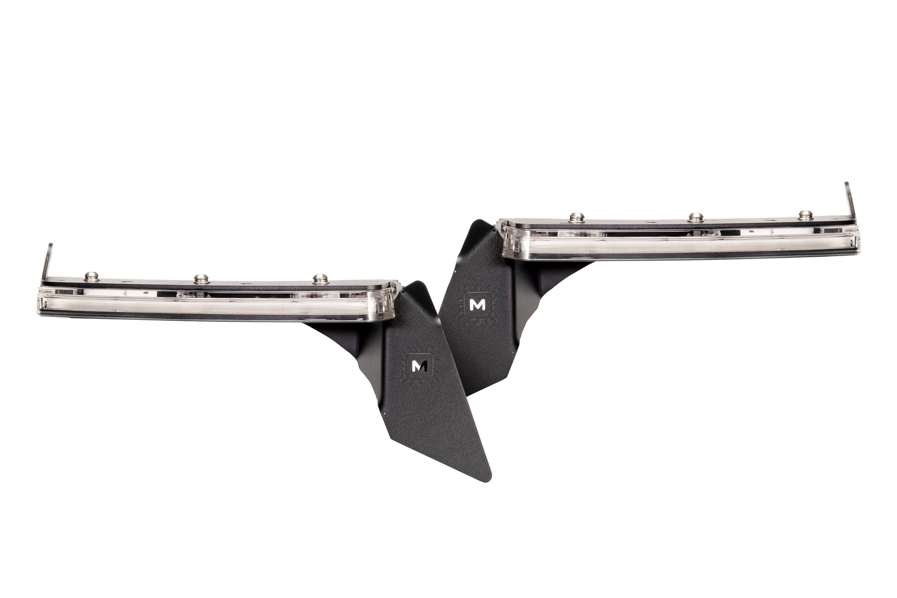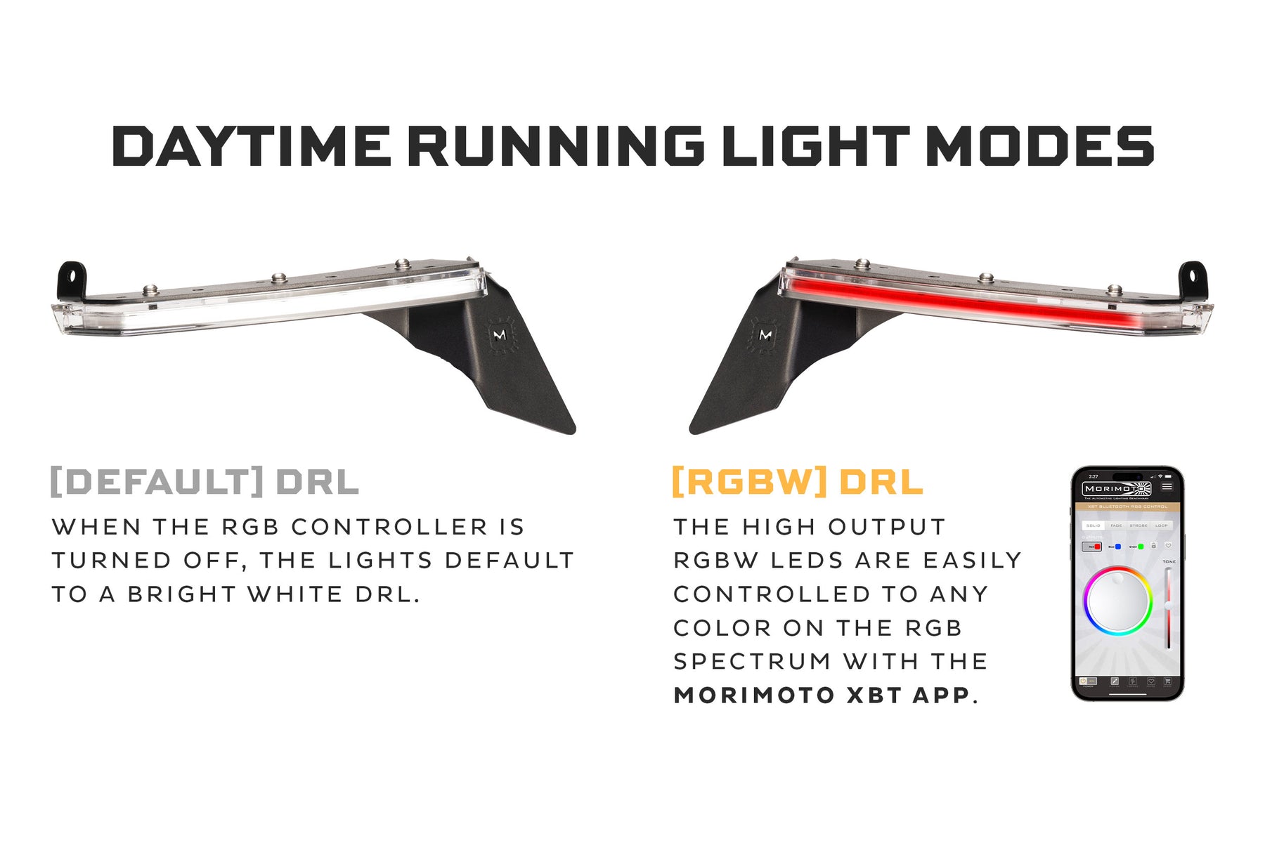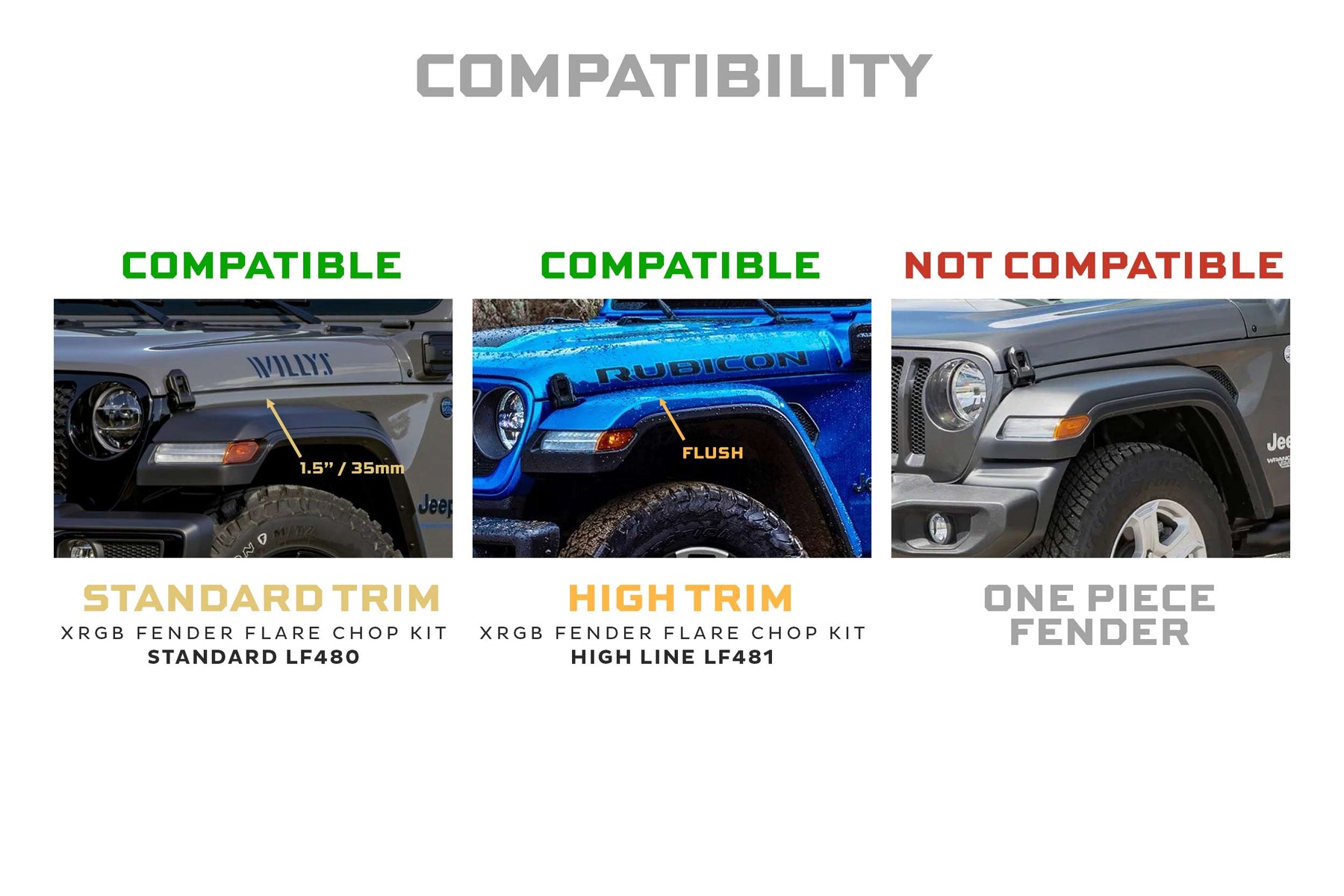 Fender Chop DRLs: Modifying your Jeep knows no bounds, but when it comes to an OEM+ look, replacing the lower section of your fenders with a low-profile DRL is a simple yet clean upgrade. While Morimoto XRGB LED DRLs are not the first to the market, they’ve been through rounds of design, fitment, and engineering phases to become the best option out there. The plug and play design means no cutting or splicing of wires ensuring your Jeep doesn’t become a hack job, and intensity that will stand out among the competition. RGB Daytime Running Lights: Inside the durable housings, the high output RGBW LEDs are easily controlled with the Morimoto XBT app on your smartphone, which too can be paired to other Morimoto RGB components like the Super7 headlight halos, rock lights, and more! When the RGB controller is turned off, the lights default to a bright white DRL. Regardless of which color your DRLs are set to, the switchback Amber turn signals take priority to show everyone your intentions. Please note: color-changing DRLs are not for on-road use in the US or Canada. Check your local laws for additional details. Easy Installation: The installation of the Morimoto XRGB LED Fender Chop DRLs is quite easy, requiring just basic tools and expertise—see the installation guide for more details on the process. All wiring is plug and play, and connects right to the stock connectors just like the factory lights. As part of the installation, the lower section of the fenders is deleted, leaving the remaining fender flare unsupported. The XRGB LED DRLs remedy this issue with powdercoated stainless steel brackets that bolt into stock mounting points and use the factory hardware. No bouncy fenders. No trip to the hardware store to hobble something together. Standard or High Line: For compatibility with most Wrangler JLs and Gladiator JTs, the Fender Chop kit is available in Standard and High Line versions. Quite simply, High Line are for Jeeps with the top of the fender is even with the hood line, whereas Standard are about 1.5 inches / 38mm below the hood line. See the compatibility photo for more details. Note: Not compatible with the base one-piece fenders. Well-Built: The XRGB LED Fender Chop DRLs are completely designed, engineered, and tested in the USA by the Morimoto team to meet the high expectations of our customers. High performance LEDs are used throughout. Housing fitment is OEM+. All wiring and connections are OE-grade. The list goes on but as the saying goes: you get what you pay for. XRGB DRLs aren't cheap, but they are built to a high standard and should easily last the life of your Jeep! We're proud to stand behind the product with an industry-leading five-year warranty supported by our team in Atlanta, GA.