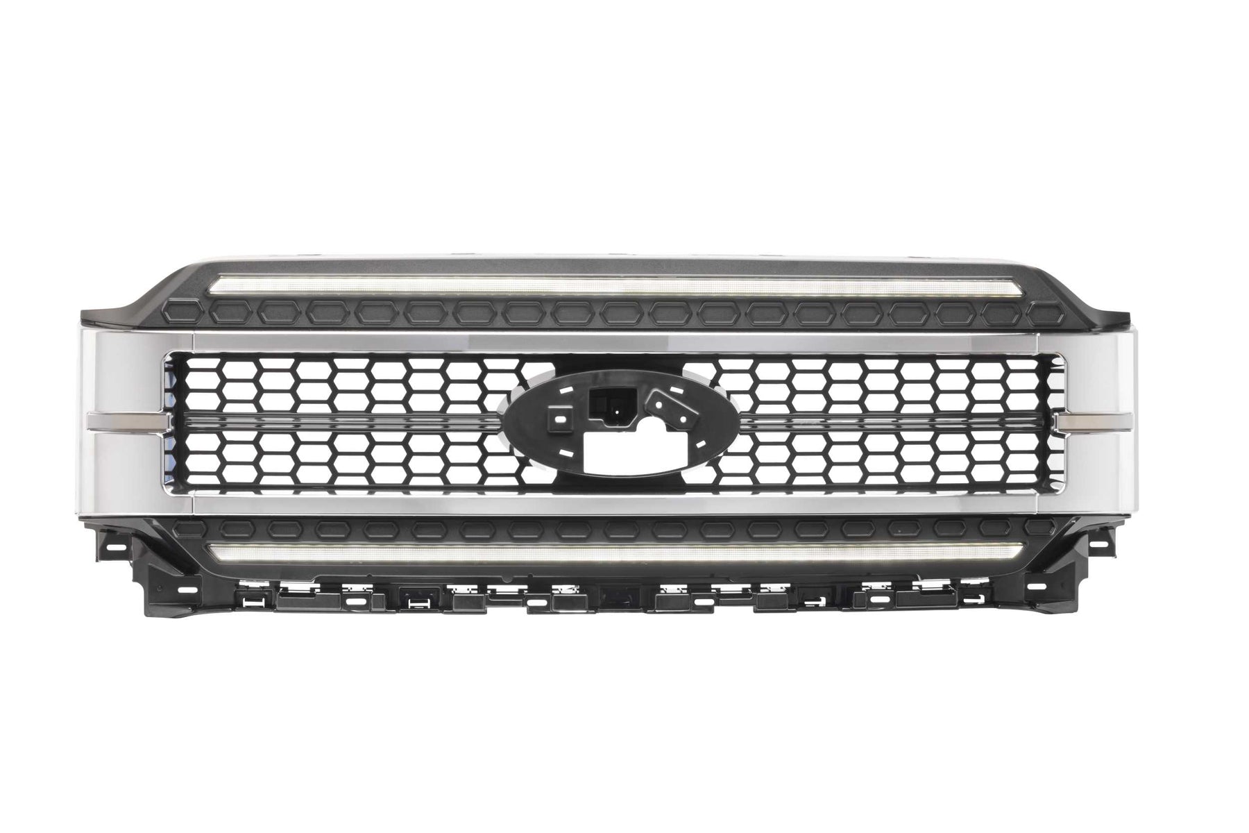 Can you see me now? With full LED headlights, tail tights, and off-road lights, You have no problem seeing at night, but that's not what this is all about. The XBG grille from Morimoto pairs high-visibility with an OEM+ style and easy installation for a perfect way to finish off the front-end of your custom Ford F-150 truck. Daytime Running Lights: Using the same automotive grade optics and Osram LEDs that come standard in Morimoto's XB LED headlights; the integrated DRL Bars are insanely bright, easily visible even from afar in broad daylight! In fact, the daytime mode is so bright that the light bars will auto-dim in parking light, low beam, or high beam mode out of necessity in order to reduce glare at dusk or in the dark. These are available with either a white or amber daytime running light. No Comparison: Put side-by-side during the day with other existing options in the aftermarket or anything you could DIY at home, and and the quality, consistency, and intensity out of the Morimoto optics would make the everything else look like a joke. If you are serious about the looks and performance of the parts you put on your truck, the XBG is the new no brainer. Customize It: The XBG grilles are highly customizable. Whether your truck is stacked with chrome or color-coordinated to the max, theres a XBG spec perfect for you. The front trim pieces can be removed with ease, painted (or wrapped), and then reassembled. The Chrome version is ready to install right out of the box. Either way, the finished look is sure to impress. Compatible: With all versions of the Ford F-150 trucks from 2021 and up, the XBG LED DRL grilles are extremely easy to install. They use all the stock mounting points, hardware, and shouldn't take more than an hour to install. While the color/intensity is a perfect match for the Morimoto XB headlights, they'll also look great alongside a set of OEM LED or any other aftermarket headlights too. Plug n Play: The XBG DRL bars have two intensities that automatically illuminate day and night based off the signals from the original headlight wiring that they are designed to connect with. The default setup intercepts the headlight signals from F-150s with the standard halogen headlights. An adapter harness is also included for trucks that came with the original-equipment LED reflector headlights. No modifications required.