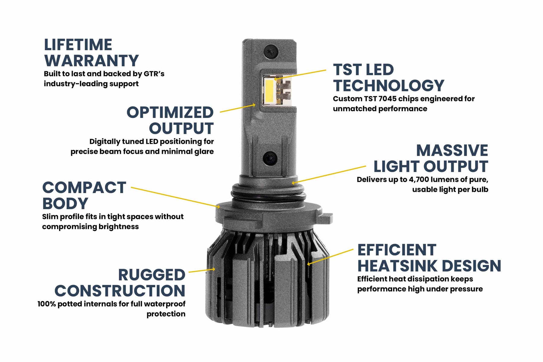 The third generation of the popular GTR LED bulbs are here--providing even more darkness-destroying output than ever before. Unlike its competitors, every aspect has been carefully considered, resulting in a multi-faceted masterpiece that leaves no detail behind. Equipped with custom TST 7045 LEDs, this powerhouse ensures unparalleled performance, while its optimized positioning guarantees efficient light distribution, eliminating wastage. With an unyielding commitment to durability, the GTR Ultra 3 is both 100% potted and waterproof, ready to conquer any challenge. Its compact form belies its strength, providing 4,700 lumens of luminous flux with effortless installation. Backed by a lifetime warranty, it's a bulb that outshines and outlasts the competition.
