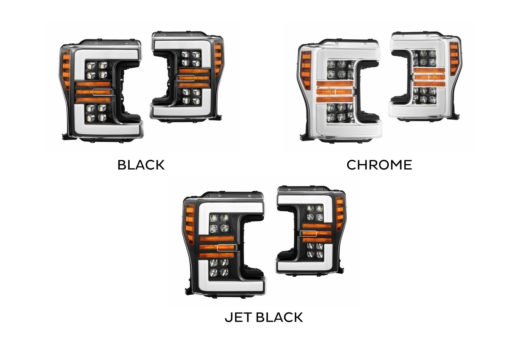 AlphaRex Is a relatively new brand in the automotive aftermarket industry. They've become known for building headlights that are unique in style, offer various color choices, and better than average construction quality. While (in our testing) they don't do as well as the slightly more expensive Morimoto XB LED headlights, they do offer good bang for the buck and certainly worth considering. If you're interested to see what else we've got in stock for your truck, use the buyer's guide on our website! AlphaRex Design Alpharex Nova Series Headlights for the Ford Super Duty use their signature 3D ice-cube projector lens system inside. Besides the horizontal NOVA projector row, They have also added a LED tube around the edge as DRL and sequential turn signal. The LED tube is not only used as switchback DRL and turn signal, it also has the activation light feature which is an animated lighting sequence when you unlock and lock your vehicle. These projector headlights have a quad projector design, with the outer 3 projector as low beam, and inner projector as high beam. Ice Cube Projector Technology AlphaRex integrated their patented Ice Cube 3D LED Projectors that are powered by Osram Black Flat LED Chips. The jewel eye projectors look great inside of the Ford Super Duty Nova Series Headlights. The projection cut-off line is perfect for American LHD regulation. Features: The AlphaRex Ford Super Duty Nova-series projector headlights come with switchback DRL, sequential signal light, and the signature activation light feature, which is a sequential light show when you unlock your car. Housing: The Ford Super Duty Nova-series projector headlights are offered with either a chrome, matte black, or shiny midnight black housing. The chrome housing gives your truck a stock housing look and match your truck if you have a lot of chrome accessories. On the other hand, the black housing gives your truck a sporty look and easily match with any color truck and front grill. Above all, the gloss/ jet black housing and mid-night black housing (all black housing with glossy finish) are their specially designed versions that has a combination of glossy looks mixed with the black paint, and it will give your truck a sporty and luxury look at the same time. Lenses: The AlphaRex headlight lenses are made of polycarbonate plastic. They also apply a layer of anti-fog agent on the headlights lens; thus, it allows better light output in extreme weather. In addition, they also apply another coating to protect the lens against yellowing and oxidation. SAE/DOT Compliance: Our Ford Super Duty Nova-series projector headlights are compliant with SAE and DOT FMVSS108 regulations. Moreover, all our products are certified to ISO-9000, ISO-9001 and ISO-9002. Most importantly, we inspect every detail of the lights to make sure we are satisfied and so are our customers. Installation: Our projector headlights are plug-n-play direct replacement for your truck. You can download the installation guide from the link in the listing above. Because these headlights have a DRL feature, you will need to apply the DRL module included in the package. No modification is required for installing these headlights; thus, our headlights are easily removable when you need to return or sell your truck and it will not void your factory warranty.