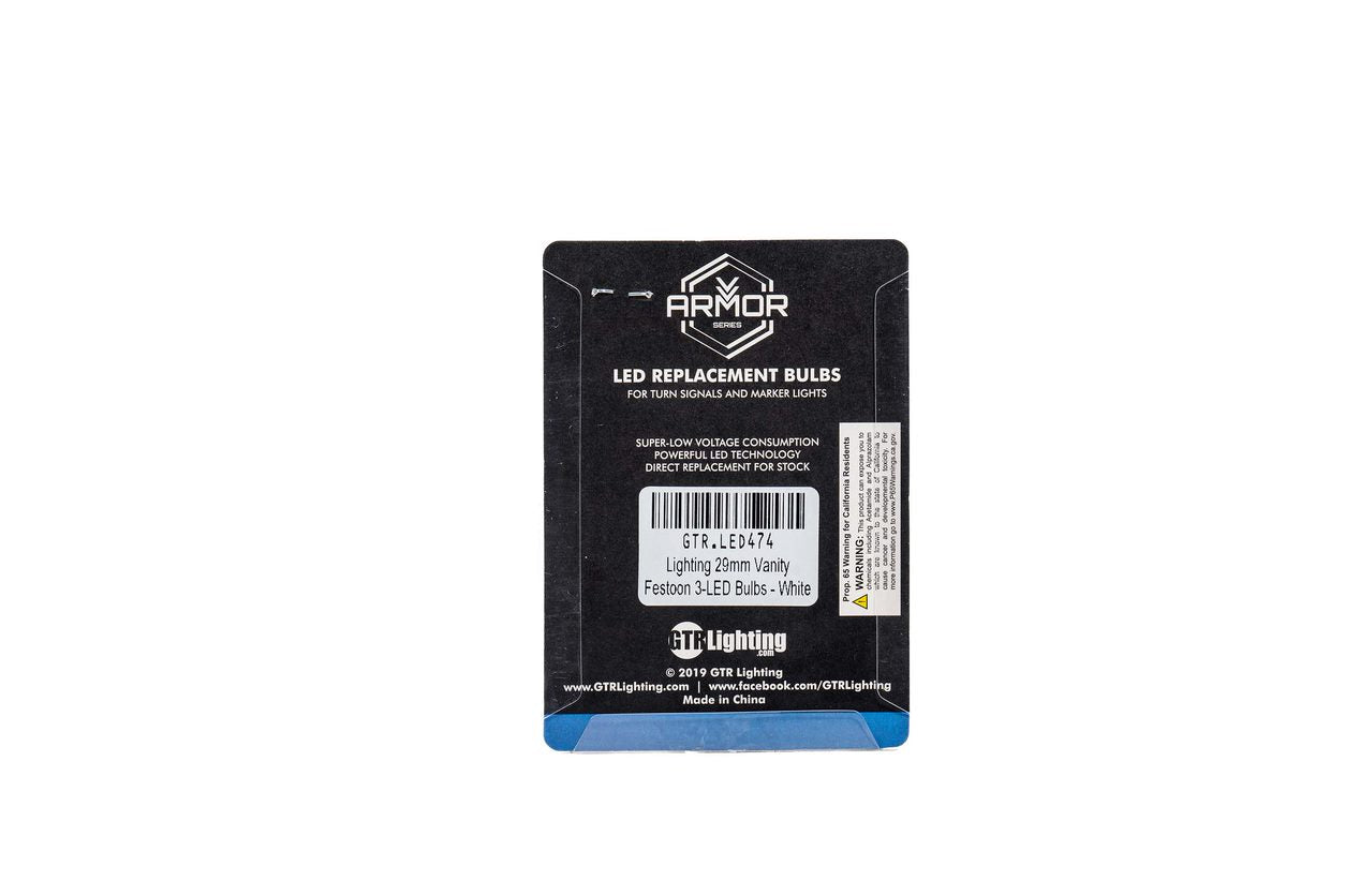 GTR Lighting 29MM "Vanity" Festoon 3-LED Bulbs: This High Power LED bulb has length of 29mm which can fit most vanity mirror or puddle light applictations that use small festoon lights. This package has 2 LED festoon bulbs that feature 3 LEDs.