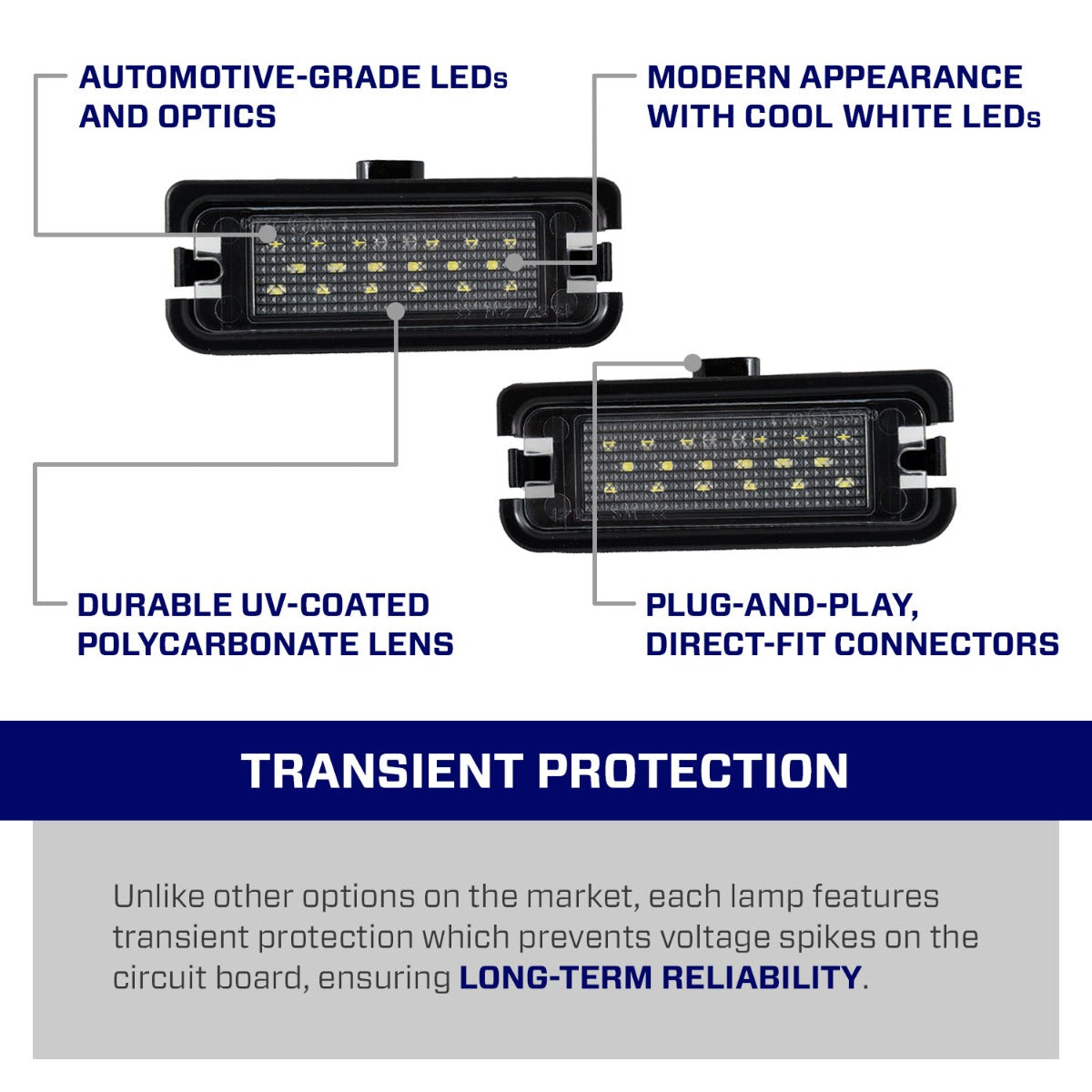 OEM-Grade Construction. Form Lighting License Plate Lights are built with quality in mind and constructed using OEM-grade materials including a UV-coated polycarbonate lens automotive-grade LEDs and optics and direct-fit connectors. Unlike other options on the market each lamp features transient protection which prevents voltage spikes on the circuit board ensuring long-term reliability. While they may not be the cheapest option on the market the fit and finish of our lamps are superior to other aftermarket units.