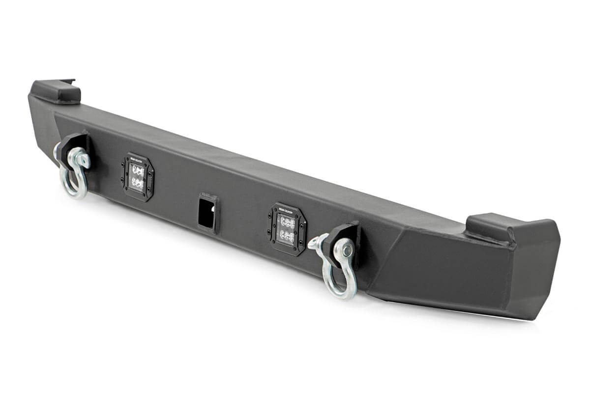 Give your Jeep a rugged, aggressive look with Rough Country's Jeep XJ Rear LED Bumper. This durable rear bumper offers a drastic improvement over the flimsy, factory bumper. With a solid-steel, 3/16 Inch construction and eye-catching good looks. Rough Country's Rear LED Bumper features a set of flush mount 2in LED cubes in the perfect position for rear-facing illumination. Each bumper also includes a set of heavy-duty d-rings with welded mounts and a recessed 2in receiver, giving you plenty of tools to navigate any trail.